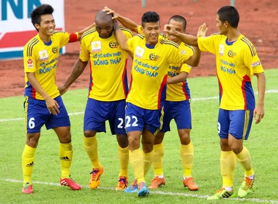 Đồng Tháp thoát hiểm ở phút cuối giúp V-League 2015 chỉ còn 1 suất xuống hạng. Ảnh: Dương Thu