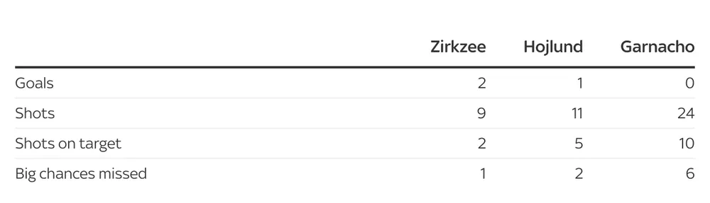 Có phải do hệ thống? Amorim đã sử dụng cùng một hệ thống tại Sporting CP, và tiền đạo trung tâm của ông lúc đó, Viktor Gyökeres, đang có trung bình 4.59 cú dứt điểm mỗi 90 phút trong mùa giải này, sau khi đạt 3.52 vào mùa trước. Đôi khi Amorim sử dụng một tiền đạo khác, Joshua Zirkzee. Anh không có mùa giải đáng nhớ – và cũng dành thời gian thi đấu ở vị trí tiền vệ tấn công, xa khung thành hơn – nhưng vẫn có trung bình 1.96 cú dứt điểm mỗi trận, gần gấp đôi Højlund.