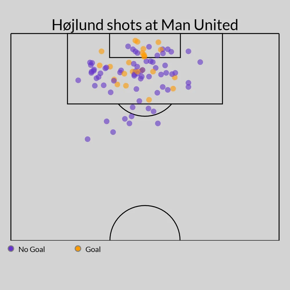 Vậy có phải do Højlund? Anh không dứt điểm nhiều dưới thời Amorim và cũng không dứt điểm nhiều dưới thời Erik ten Hag (chỉ ở mức 1.40, vẫn rất thấp). Trên thực tế, anh cũng không dứt điểm nhiều trong mùa giải tại Sturm Graz ở Áo, với chỉ số 2.10 cú dứt điểm mỗi 90 phút. Lần duy nhất con số của anh vượt quá 2.5 là trong sáu tháng tại Atalanta, khi anh đạt 2.65, mặc dù đó là một đội bóng có lối chơi tấn công và nhịp độ cao hơn nhiều.