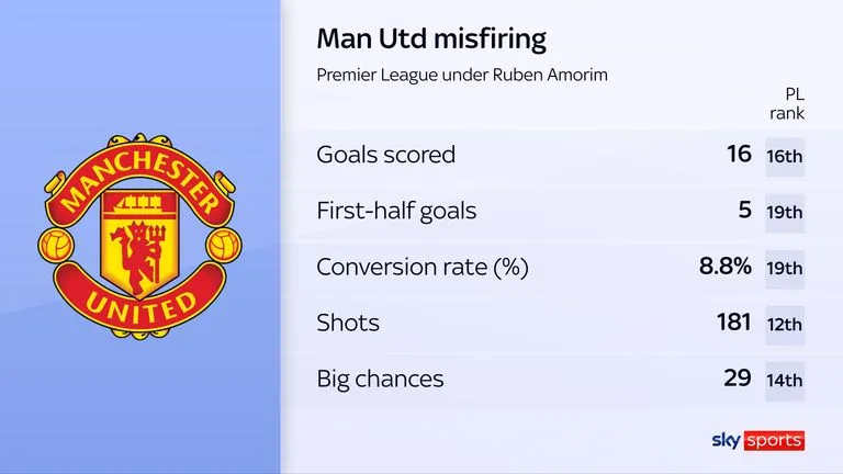 Kể từ khi Amorim tiếp quản Man Utd vào tháng 11, các số liệu tấn công của đội bóng đã trở nên đáng lo ngại. Trong khoảng thời gian này, chỉ có bốn đội bóng khác tại Premier League ghi ít bàn thắng hơn họ. Đáng lo ngại hơn là phong độ của họ trong hiệp một; chỉ có một đội ghi ít bàn thắng hơn và có tỷ lệ chuyển hóa cơ hội thấp hơn Quỷ đỏ.