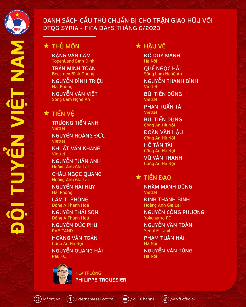 Qua đó, HLV Troussier đã giữ lại 21 trong tổng số 23 cầu thủ trong danh sách đăng ký thi đấu trận gặp Hồng Kông (Trung Quốc) vừa qua, đồng thời lựa chọn bổ sung 6 cầu thủ đội tuyển Việt Nam và 3 cầu thủ đội tuyển U23 Việt Nam chưa thi đấu ở trận Hồng Kông (Trung Quốc) vào danh sách chuẩn bị cho trận đấu với đội tuyển Syria.