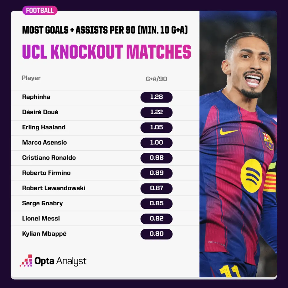 Không chỉ Real Madrid và PSG, Barcelona cũng sở hữu những cầu thủ biết tỏa sáng đúng lúc. Raphinha dẫn đầu danh sách cầu thủ có tỷ lệ đóng góp bàn thắng mỗi 90 phút cao nhất lịch sử vòng knock-out Champions League (1,28). Mùa trước, anh cân bằng kỷ lục của Ronaldo về số lần đóng góp bàn thắng trong một mùa giải (21), với 8 lần đến từ giai đoạn knock-out.