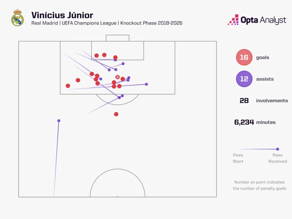 Real Madrid đang gặp khó khăn ở La Liga và đã bị loại sớm khỏi Copa del Rey bởi đội hạng nhì Albacete. Champions League trở thành cơ hội duy nhất để giành danh hiệu, với kỷ lục 15 lần vô địch châu Âu. Vinicius chính là nhân tố then chốt. Cầu thủ Brazil đã ghi bàn quyết định ở chung kết 2018 trước Liverpool và 2024 trước Borussia Dortmund tại Wembley. Tuần qua, anh lập cú đúp ấn tượng trước Manchester City, giúp Madrid vào tứ kết. Vinicius hiện có 28 lần góp công ở knock-out Champions League (16 bàn, 12 kiến tạo) – ngang bằng Kylian Mbappe và xếp thứ 6 lịch sử (sau Ronaldo 82, Messi 61, và vài cái tên khác).