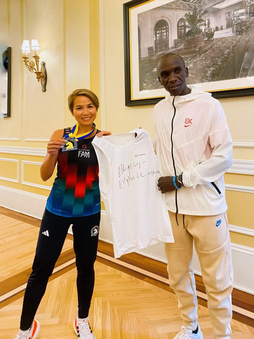 “Sau buổi gặp chung, khi Kipchoge định rời đi, tôi xin anh ấy nán lại ít phút, xin chữ ký và nói tâm sự từ tận đáy lòng, thể hiện sự ngưỡng mộ. Kipchoge vui vẻ nhận lời. Tôi nói đã thần tượng anh ấy từ rất lâu, rằng anh ấy vẫn truyền cảm hứng cho các runner trên toàn thế giới nói chung, ở Việt Nam nói riêng, những người đêm ngày vẫn đang chạy, lao về phía trước, và nếu có dịp, hy vọng anh ấy sẽ tham gia chạy ở châu Á để tiếp thêm sức mạnh cho niềm cảm hứng chạy bộ bất tận của các runner trong khu vực!”.