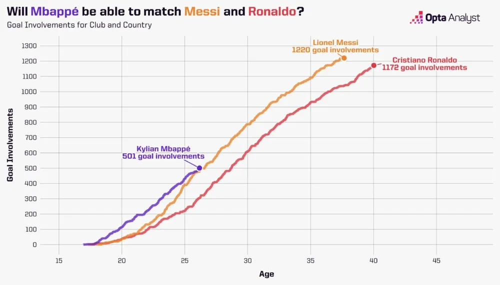 Mbappé dĩ nhiên còn cách xa cả hai, cả về thời gian thi đấu lẫn tổng số bàn thắng. Tuy nhiên, 501 lần tham gia bàn thắng của anh ở tuổi 26 năm và 61 ngày nhiều hơn so với những gì Messi và Ronaldo đạt được ở cùng độ tuổi tại các câu lạc bộ hàng đầu và đội tuyển quốc gia.
