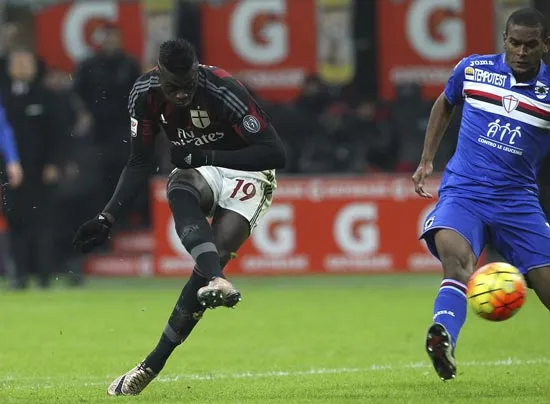 M’Baye Niang (trái, Milan) ghi bàn vào lưới Sampdoria.