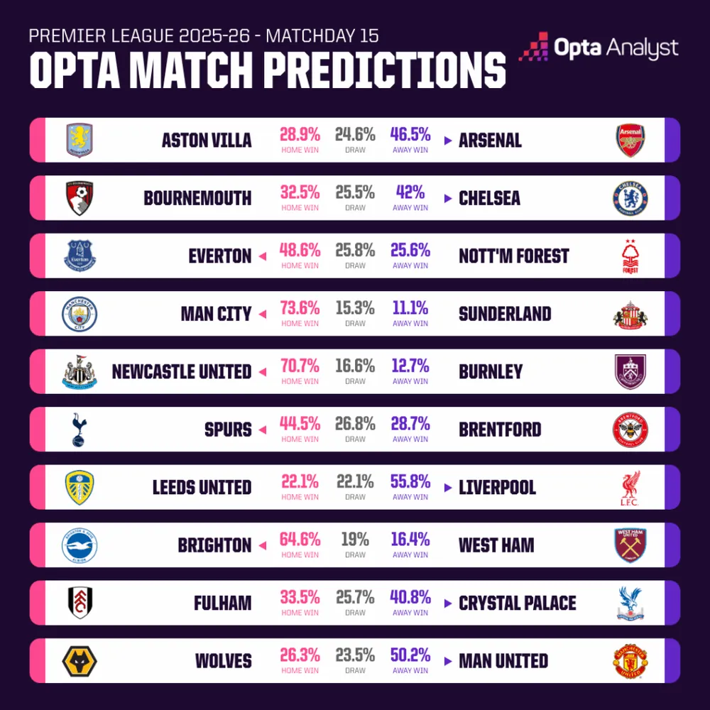 - Liverpool (55.8%) được dự đoán là đội khách có khả năng thắng cao nhất, cần một chiến thắng trên sân khách để chữa lành vết thương.