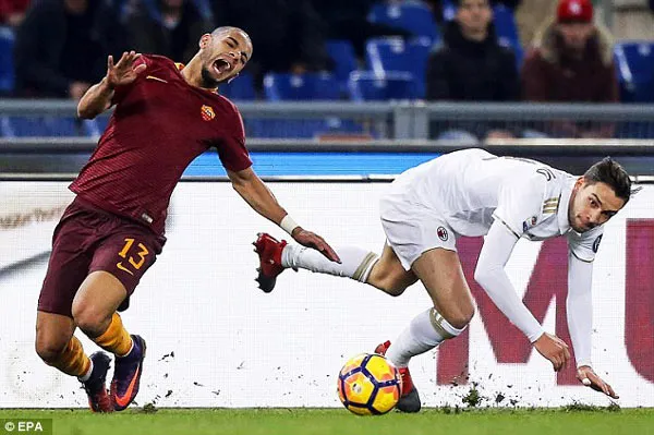 Pha tranh bóng quyết liệt giữa Bruno Peres (trái, AS Roma) và cầu thủ của AC Milan. Ảnh: EPA