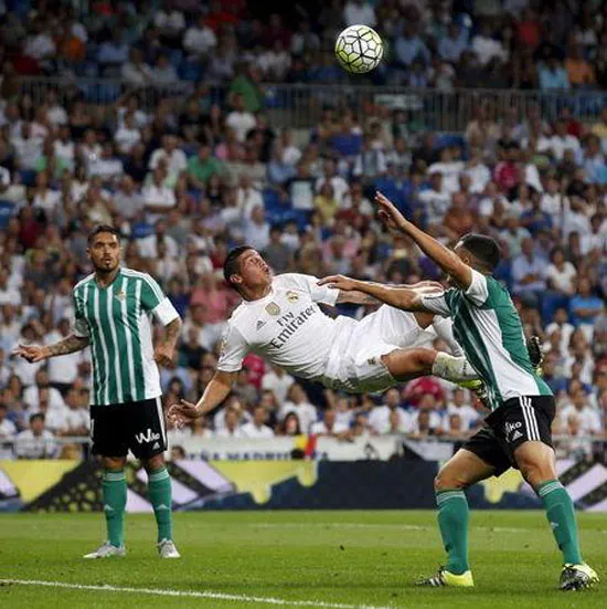 Tiền vệ James Rodriguez (áo trắng) tung người móc bóng ghi bàn nâng tỷ số lên 4 - 0 cho Real Madrid. Ảnh: Reuters