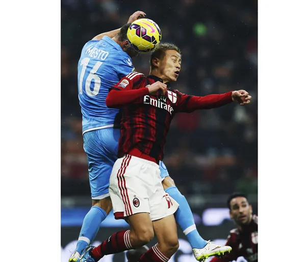 Keisuke Honda (phải, Milan) trong pha không chiến với Giandomenico Mesto (Napoli)