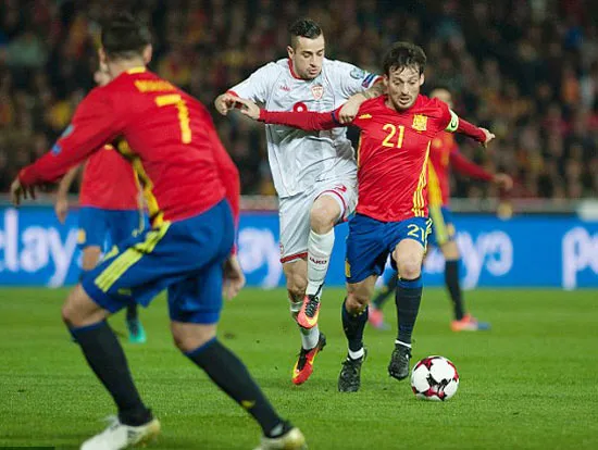 David Silva (phải) đi bóng trước hàng phòng ngự Macedonia