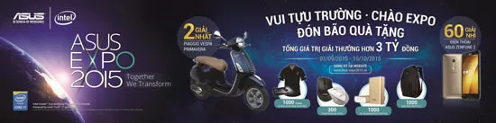 Theo đó, khi mua bất kỳ sản phẩm chính hãng của ASUS trong danh mục khuyến mãi, khách hàng đăng ký thông tin tại website www.asus-expo.2015.vn sẽ nhận ngay mã rút thăm để có cơ hội sở hữu một trong những giải thưởng: 2 giải nhất (mỗi giải 1 xe Piaggio Vespa Primavera); 60 giải nhì (mỗi giải 1 điện thoại ASUS ZenFone 2). Lễ rút thăm trúng thưởng được tổ chức ngay trong khuôn khổ ASUS Expo 2015 tại 2 miền Nam- Bắc.