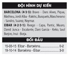 Eibar sẽ tiếp tục lối đá mạnh mẽ ấy khi làm khách của Barca. Một thử thách thực sự dành cho đội chủ nhà, vốn đang quyết tâm chinh phục ngôi đầu bảng. Mùa trước, Barca thắng Eibar trong cả 2 lần gặp gỡ, và không thủng lưới. Nhưng cuộc chạm trán lần này sẽ khác.