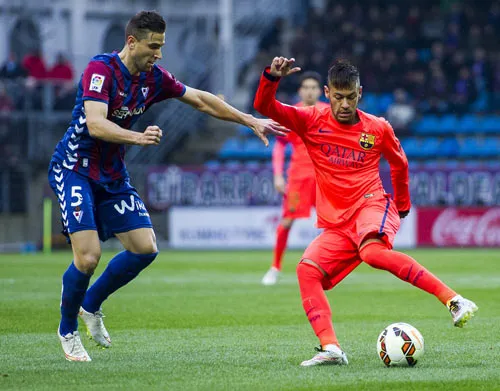 Neymar (phải) xử lý bóng trước hậu vệ Ekiza.
