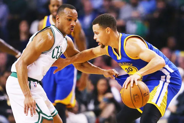 Stephen Curry (phải) đang đi bóng trước sự truy cản của Avery Bradley.