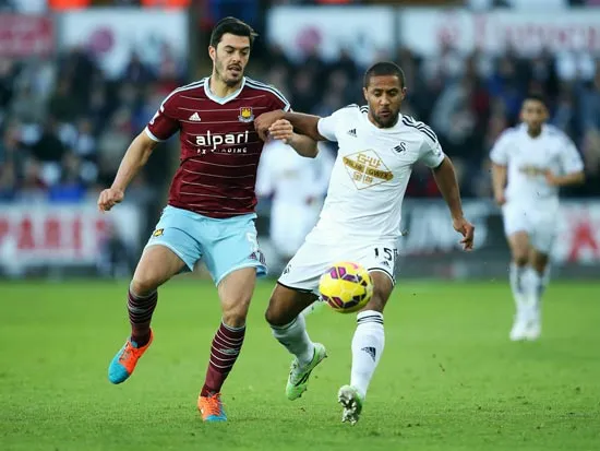 James Tomkins (trái, West Ham) tranh bóng với Wayne Routledge (Swansea)