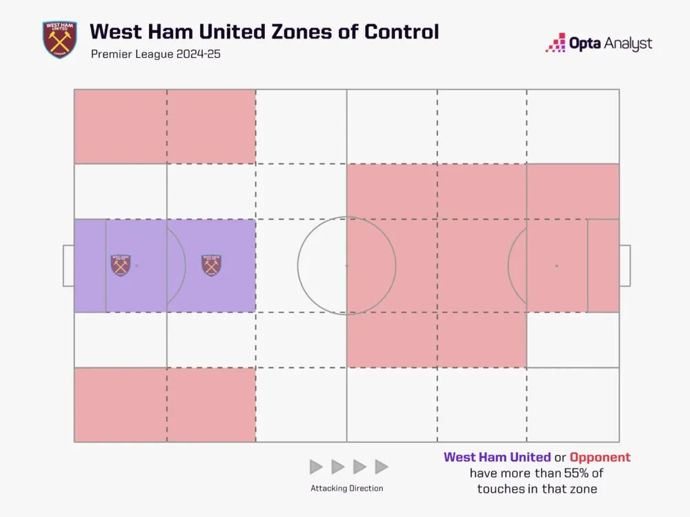 Nhưng có lẽ "khu vực kiểm soát" là minh họa rõ nhất cho việc Lopetegui đã không thể biến West Ham thành một đội bóng kiểm soát bóng tốt và thoải mái với khả năng kiểm soát bóng. Biểu đồ bên dưới cho thấy cách họ chỉ nắm giữ được 55% hoặc hơn bóng ở hai khu vực phòng ngự trung tâm.