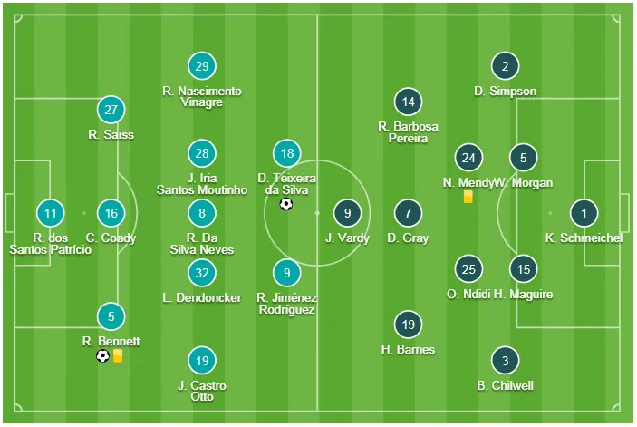 Bennett (giửa) bật lên đánh đầu chính xác trước sự cản phá của Maguire 2-1 Phút 47, ngay trong đợt phản công đầu tiên, Leicester City đã tìm thấy bàn thu ngắn cách biệt. Từ quả đánh đầu giải vây của hậu vệ trong khu cấm địa, bóng được đưa lên vòng trung tâm cho James Vardy, anh lập tức tỉa sang phải cho Demarai Gray băng xuống. Cầu thủ trẻ đã vượt qua 2 chiếc áo vàng trước khi tung cú sút chéo góc, làm tung lưới Wolves.