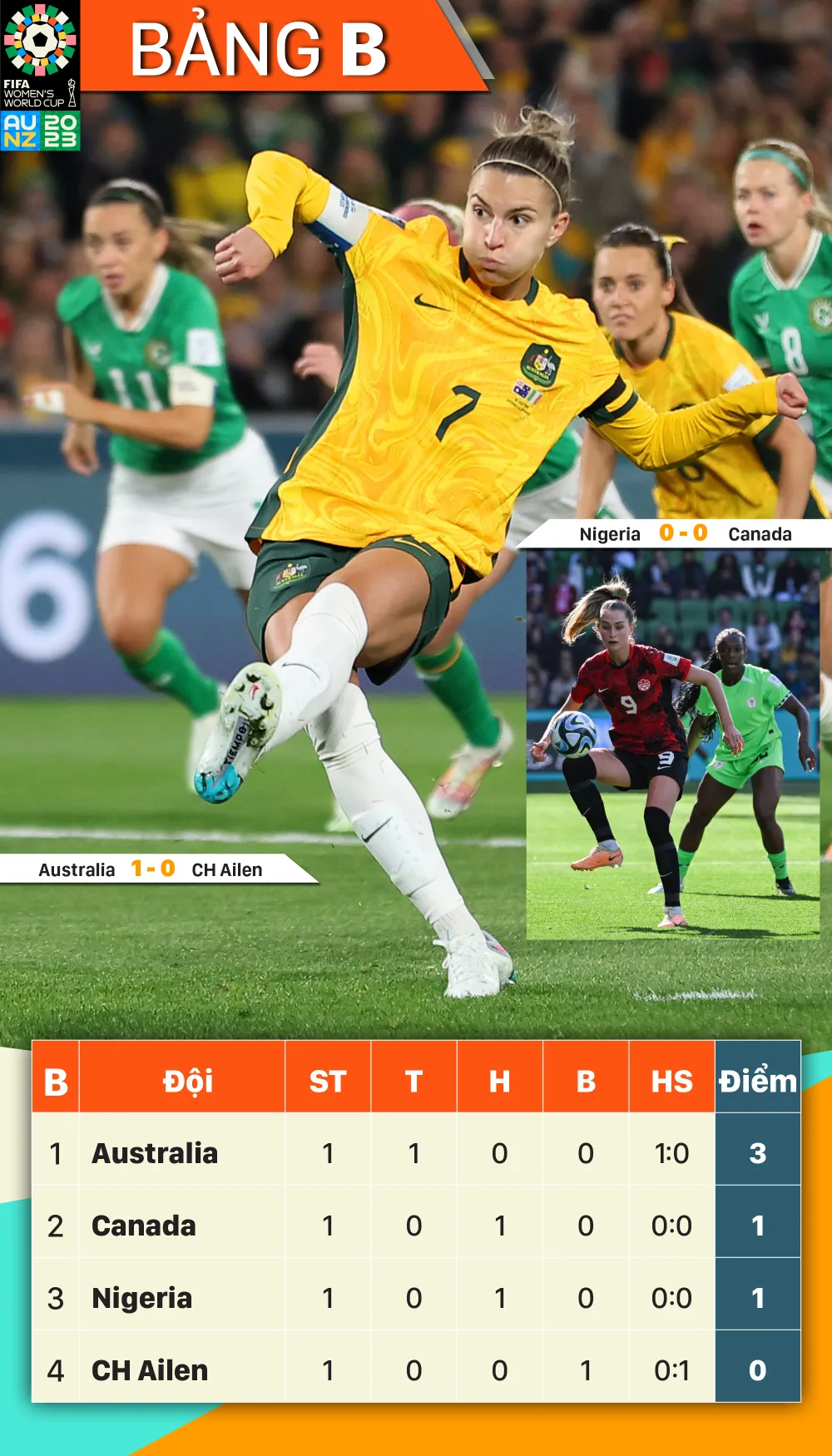 World Cup nữ 2023: Kết quả và xếp hạng bảng B