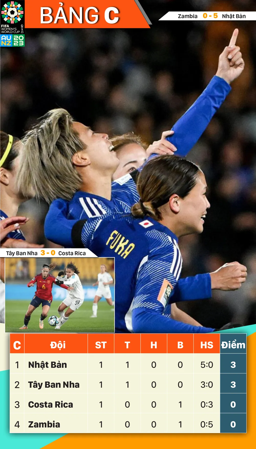 World Cup nữ 2023: Kết quả và xếp hạng bảng C