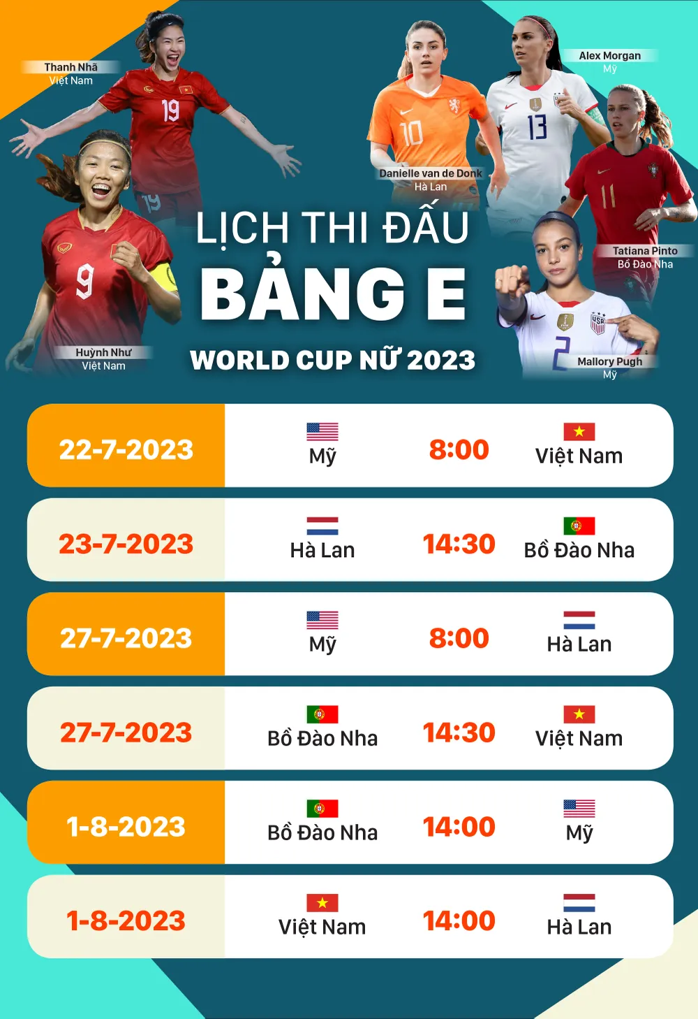 Tuyển Việt Nam sẽ đi vào lịch sử với trận ra quân ở một vòng chung kết World Cup vào sáng mai. Thầy trò HLV Mai Đức Chung sẽ thi đấu trong bảng E với những đối thủ mạnh nhất thế giới, bao gồm đương kim vô địch Mỹ, Á quân thế giới Hà Lan và tân binh Bồ Đào Nha. Hãy cùng dõi theo Huỳnh Như và các đồng đội trong lịch thi đấu dưới đây.
