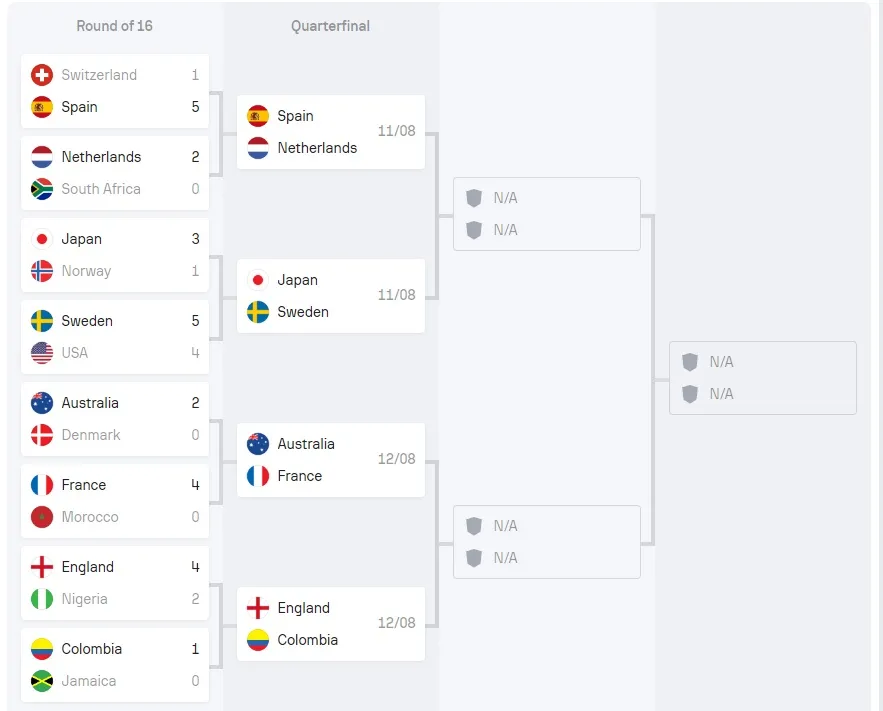 Vòng tứ kết World Cup 2023 mang đến những cuộc đụng độ hấp dẫn ngoài mong đợi: Làn gió mới Nhật Bản thách thức đội hạng 3 thế giới Thụy Điển; á quân World Cup Hà Lan chạm trán Tây Ban Nha; chủ nhà Australia tiếp đón tuyển Pháp, trong lúc nhà vô địch Euro 2022 Anh đụng độ Colombia.
