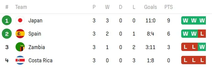 Tây Ban Nha đã bị đánh bại một cách rõ ràng dù cầm bóng 77% và thực hiện hơn 900 đường chuyền. Cả hai đội đều đã giành quyền vào vòng knock-out sau khi giành chiến thắng thuyết phục trong 2 trận đầu. HLV Nhật Bản Futoshi Ikeda đã thực hiện 5 sự thay đổi so với trận thắng Costa Rica (2-0) và giúp tuyển Nhật Bản vượt lên dẫn trước ở phút thứ 12 bằng một pha phản công mẫu mực.