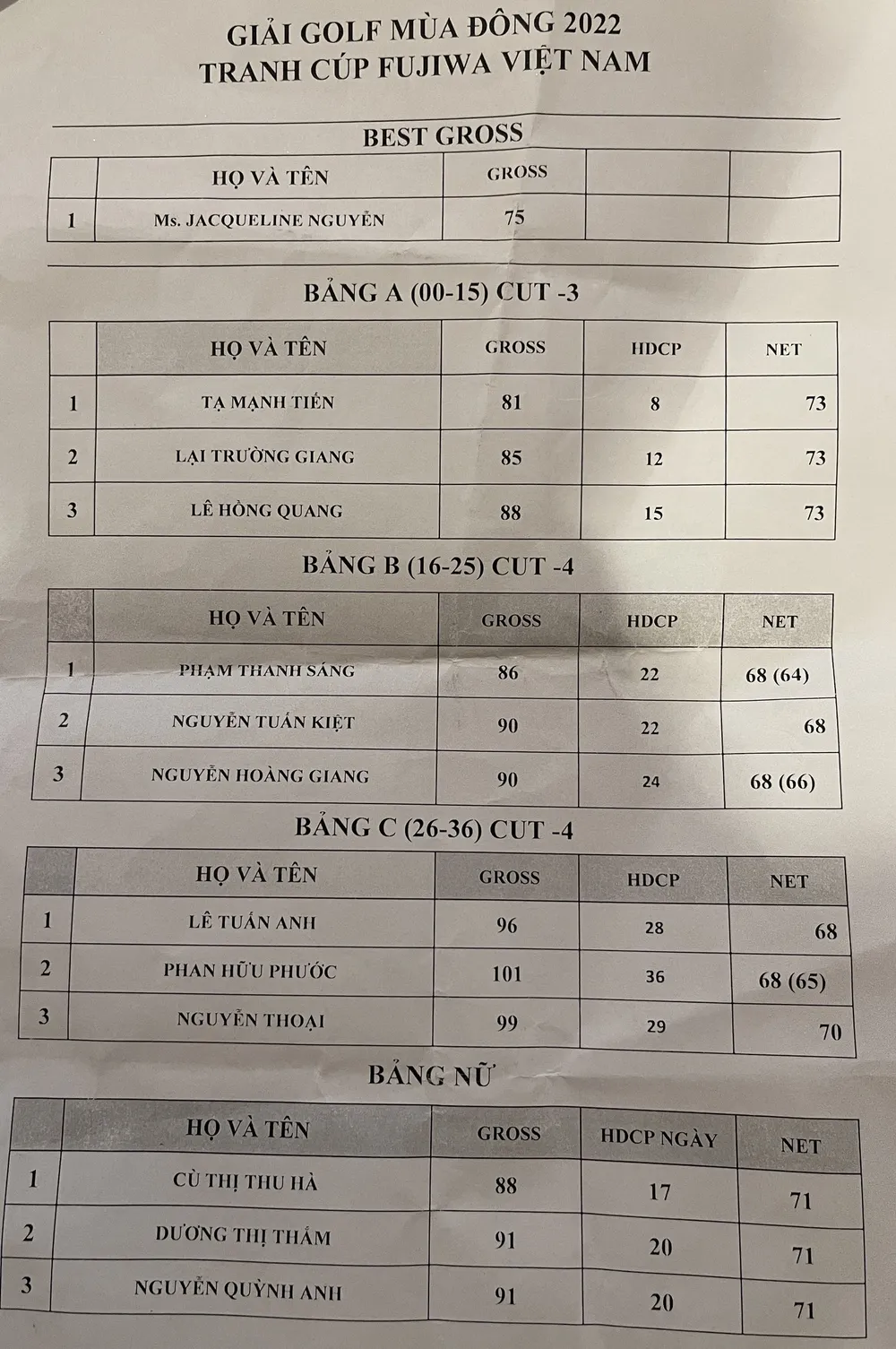 Với điểm Gross 75, tuyển thủ Ms. Jacqueline Nguyễn đã vượt hơn 200 người chơi khác để giành được giải Best Gross tại giải đấu lần này. Ngoài ra, ở mỗi bảng đấu cũng tìm ra được ngôi vô địch xứng đáng, cụ thể: bảng nam A (Tạ Mạnh Tiến), nam B (Phạm Thanh Sáng), nam C (Lê Tuấn Anh), nữ (Cù Thị Thu Hà). Ngoài ra, ban tổ chức còn tính điểm để trao các giải kỹ thuật (Longest Drive, Nearpin và Nearline).