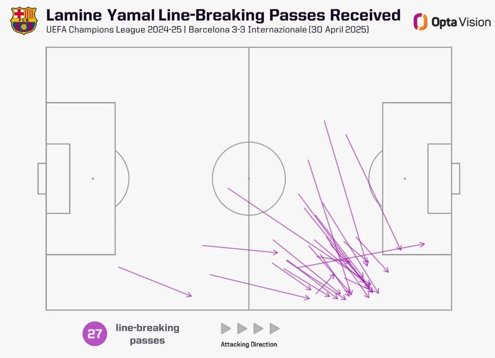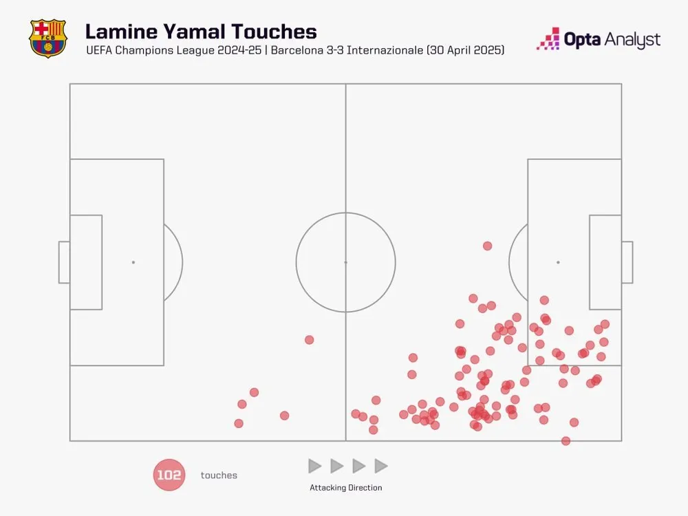 Mười bảy trong số các lần chạm bóng của cậu diễn ra trong vòng cấm đối phương, chỉ kém ba lần so với tổng số lần chạm bóng trong vòng cấm của cả đội Barcelona (20) và nhiều hơn hai lần so với Inter (15). Chỉ một cầu thủ – Franck Ribéry, với 18 lần trước Real Madrid vào ngày 25 tháng 4 năm 2018 – từng có nhiều lần chạm bóng hơn trong vòng cấm ở một trận bán kết Champions League. Yamal đang chứng minh tuổi tác chỉ là con số, nhưng thật đáng chú ý khi Ribéry đã 35 tuổi – gấp đôi tuổi Yamal – trong trận đấu đó.