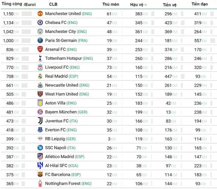 Manchester City xếp thứ ba với đội hình trị giá 898,5 triệu bảng, tiếp theo là Paris Saint-Germain (862,3 triệu bảng), Arsenal (720,9 triệu bảng), Tottenham (714,9 triệu bảng), Liverpool (664 triệu bảng), Real Madrid (610,5 triệu bảng)., Newcastle (570 triệu bảng) và West Ham (435,5 triệu bảng).