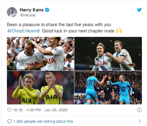 Tiền đạo Tottenham, Harry Kane cũng chúc Eriksen tìm thấy thành công ở CLB mới và cảm ơn anh ấy vì đã dành thời gian cống hiến cho đội. Kane viết: “Rất vui được chia sẻ 5 năm qua với bạn @ ChrisEriksen8. Chúc may mắn trong chương tiếp theo của bạn”.